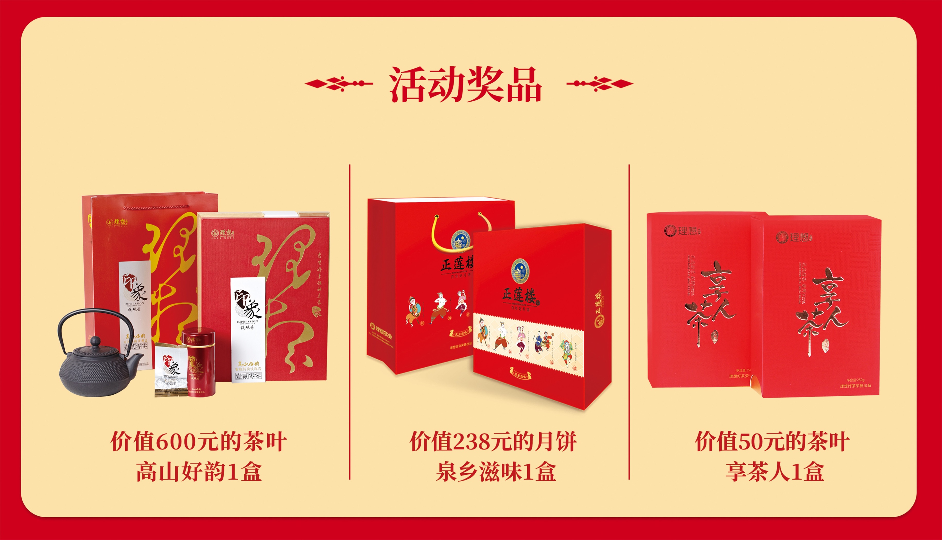眾所周知,在閩南地區(qū),除了吃月餅、賞秋月之外,還有一項(xiàng)特有的中秋風(fēng)俗——博餅。貼心如理想好茶,為使本次活動(dòng)更加豐富圓滿,理想好茶特別贊助博餅禮——好茶“高山好韻”、“享茶人”,月餅“泉鄉(xiāng)滋味”,以及500張VIP現(xiàn)金抵用券。